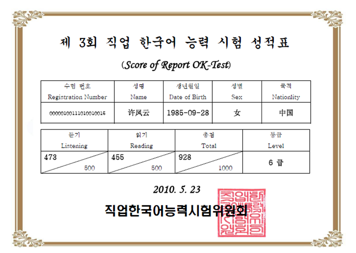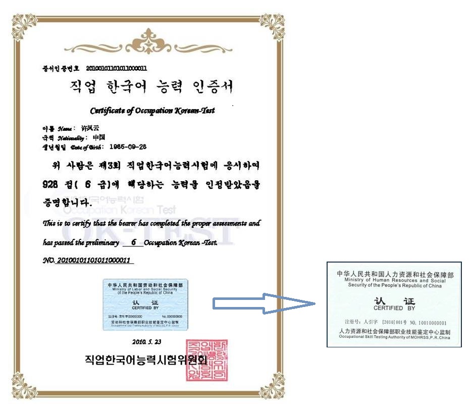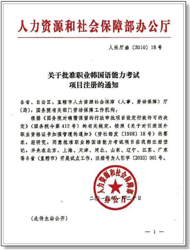 3、2010年1月20日,OK-TEST职业韩国语考试正式获得中华人民共和国人力资源和社会保障部注册批准 (人引字[2010]001号),OK-TEST证书已被与英语托业、日语托业纳入中国国家职业资格证书统一的管理体系。
