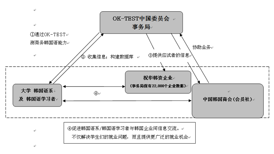 2、“OK-TEST职业韩国语能力考试”得到了韩国商会及在华韩国企业的大力支持和高度认可。目前通过OK-TEST考试的考生,经由OK-TEST中国考试委员会收集各地考生的简历及资料,推荐给韩国各大企业及韩国商会,可以给应试者提供韩国商会或者企业的应聘机会,并帮助应试者就业。目前与OK-TEST中国考试委员会签订合作协议的韩国商会有北京、天津、上海、广州、东莞、无锡、延边、连云港、威海等各地韩国商会及友利银行、浦项集团等大型韩国企业。